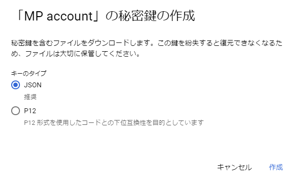 [キーのタイプ]に「JSON」を選択し、 [作成]をクリックすると 秘密鍵ファイルがダウンロードされる。