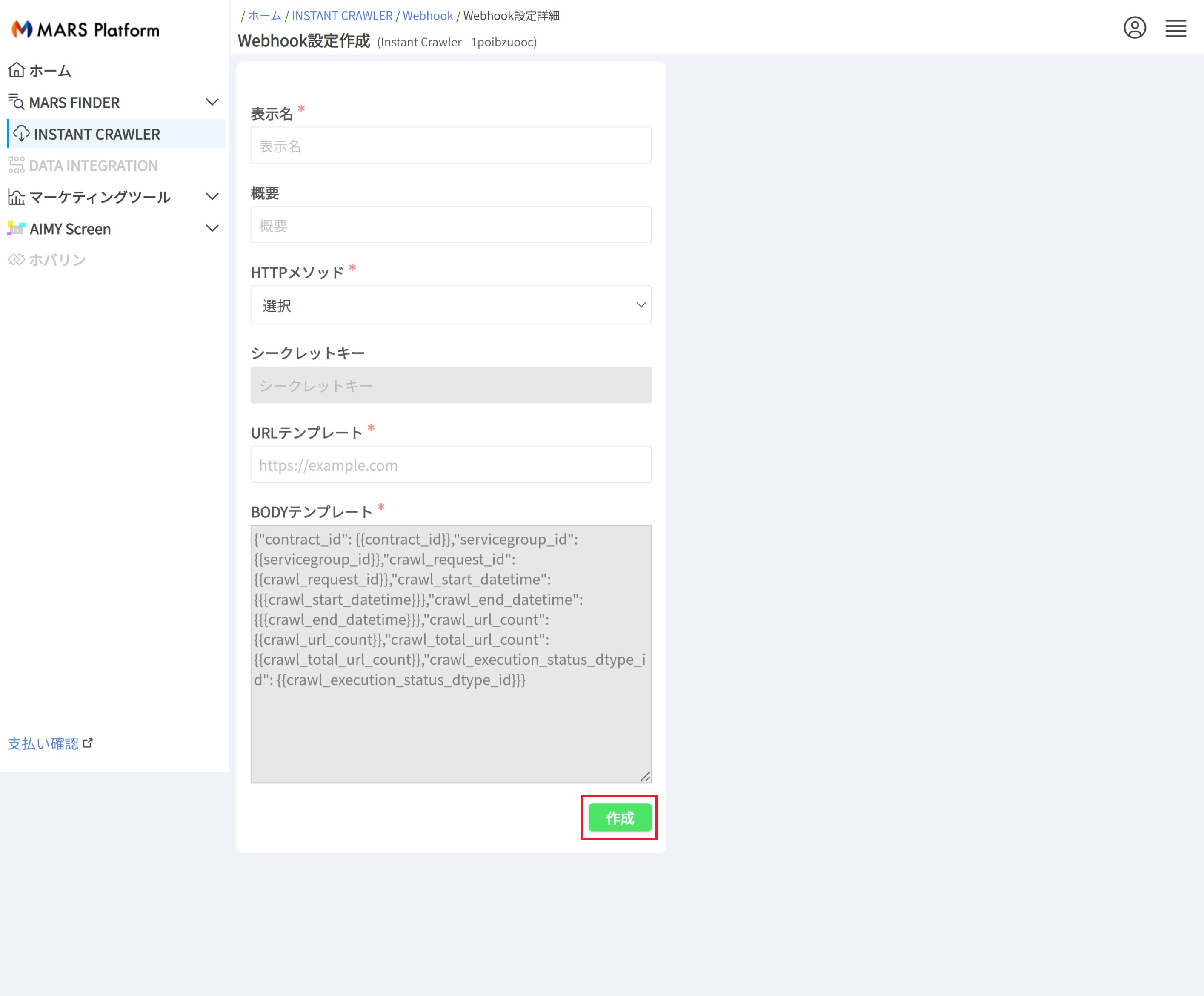 ③各項目に情報を入力し、「作成」ボタンを押下します。